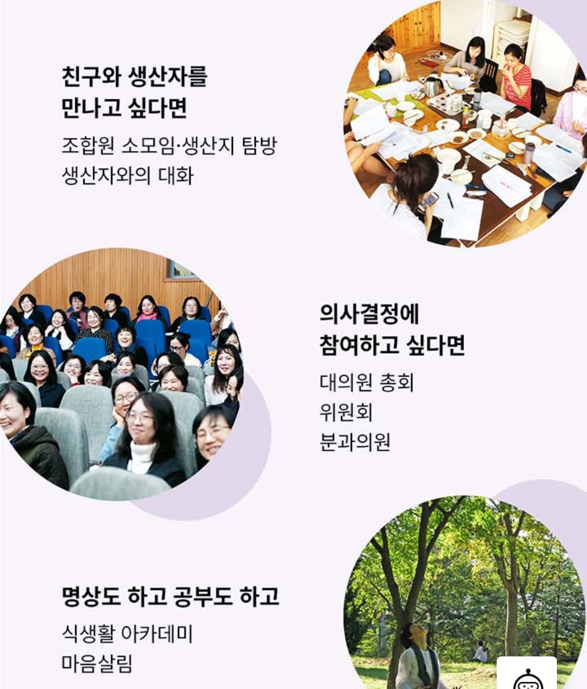 그리고 조합원이 되면, 이사회, 대의원 분과활동등을 할 수 있고, 마을 모임, 생산지 교육, 강좌 행사에도 참여 할 수 있습니다.