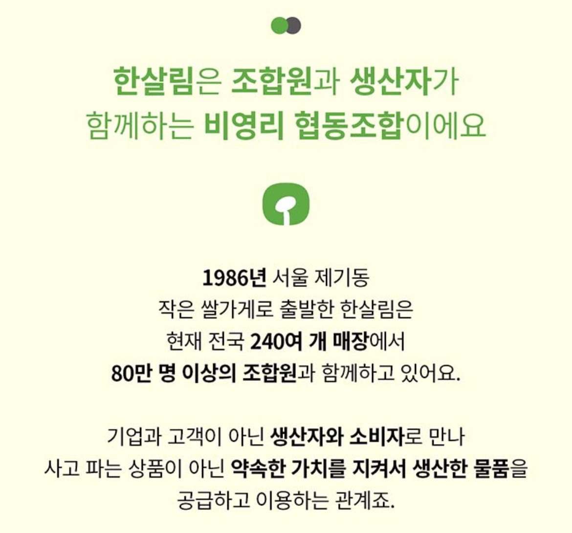 한살림은 좋은 오히려 좋은 제품을 믿을 수 있고 가격도 비싸지 않아요.
