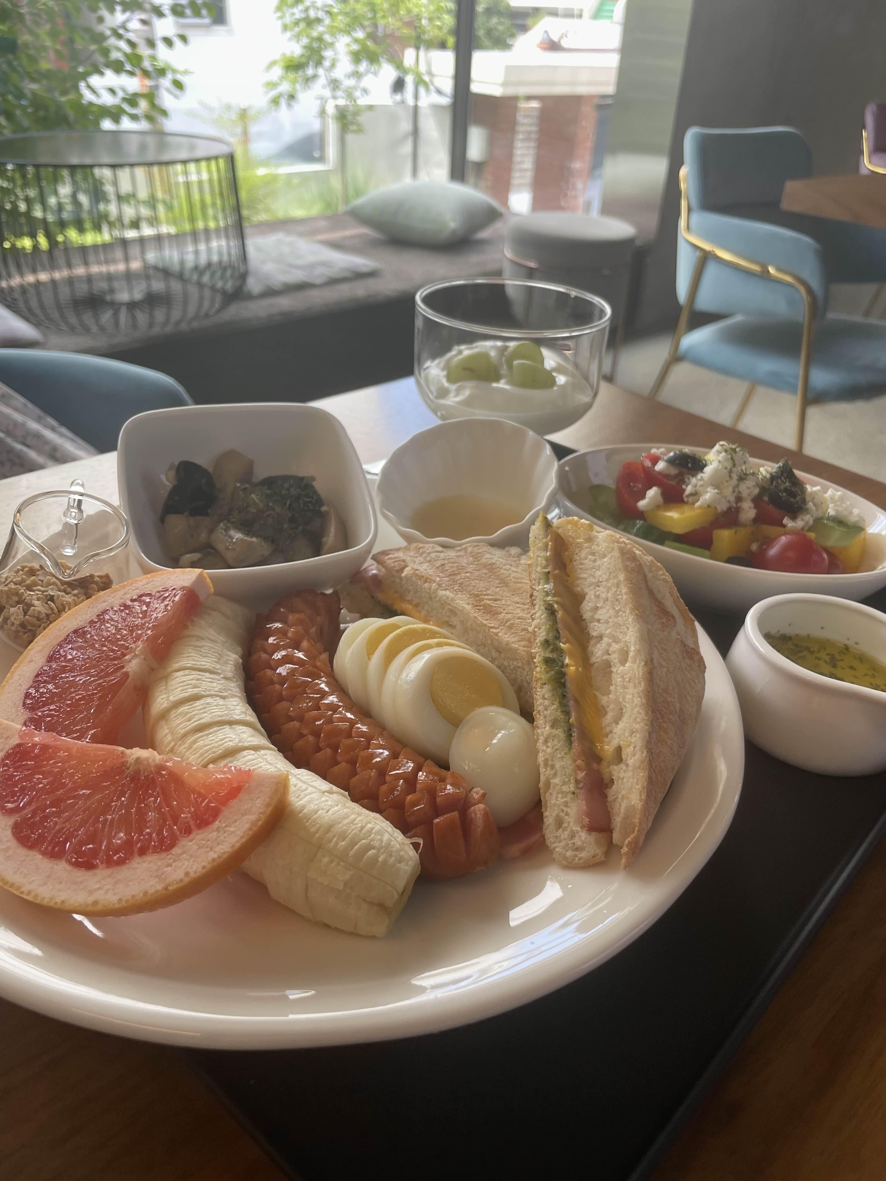 파니니, 자몽, 바나나, 소시지, 베이컨, 삶은 달걀, 그릭요거트, 볶음 버섯, 샐러드, 그래놀라가 나옵니다.
