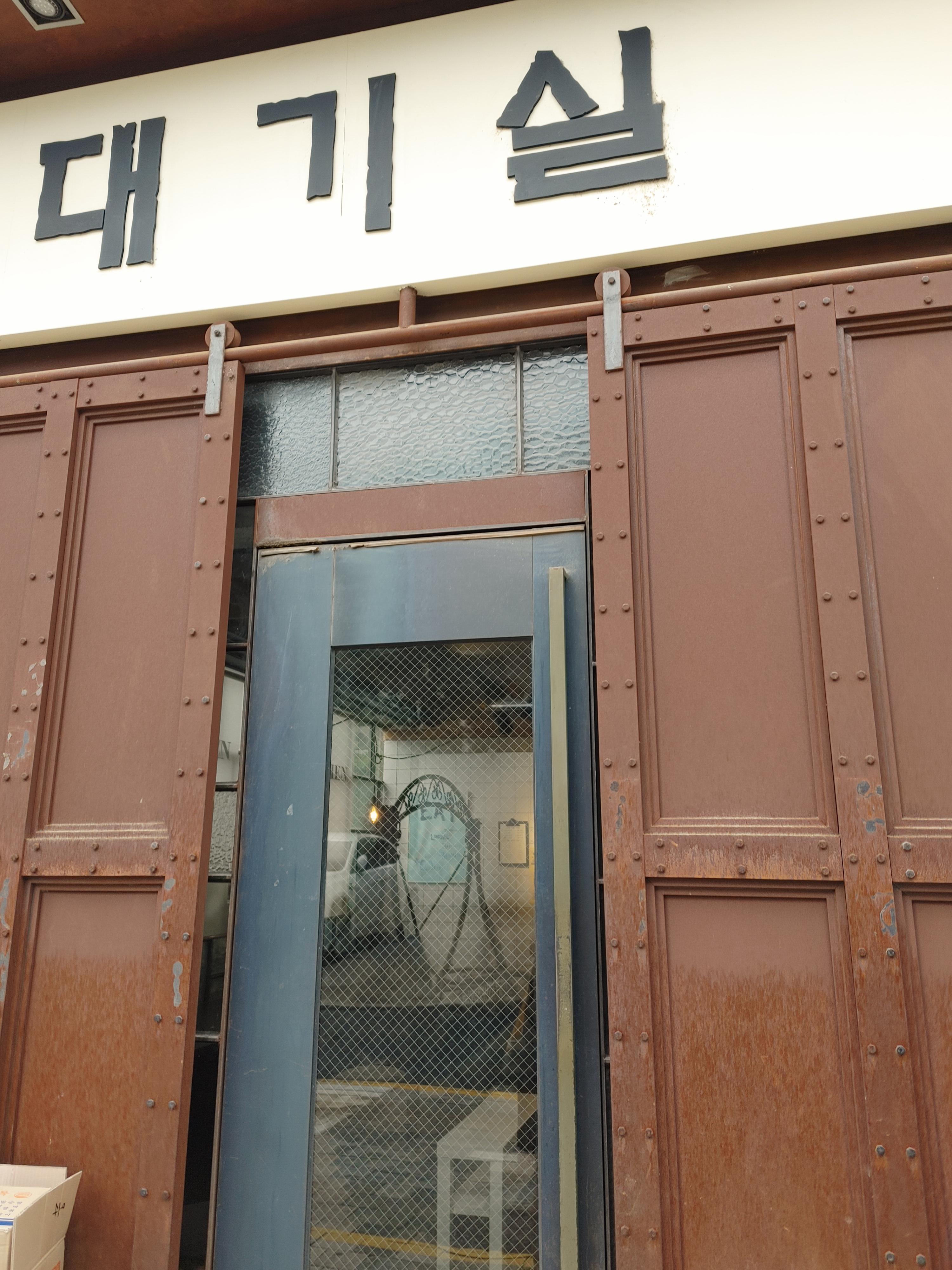 클래식 한 느낌의 간판과 옆에 대기길이 있습니다.