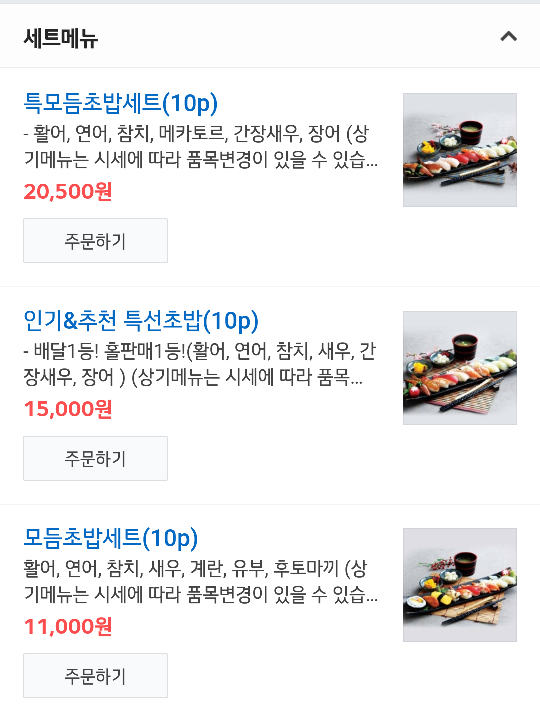 활어 연어 참치 새우 계란 유부 후토마끼 가 있습니다.