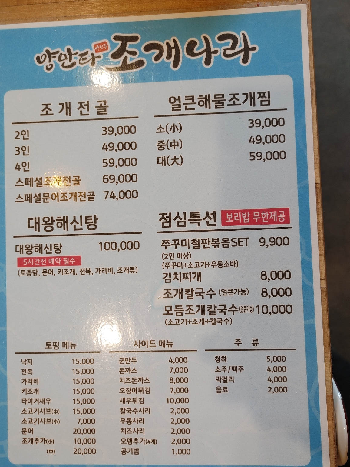 조개 전골, 조개찜,쭈꾸미, 칼국수가 주 메뉴 입니다.